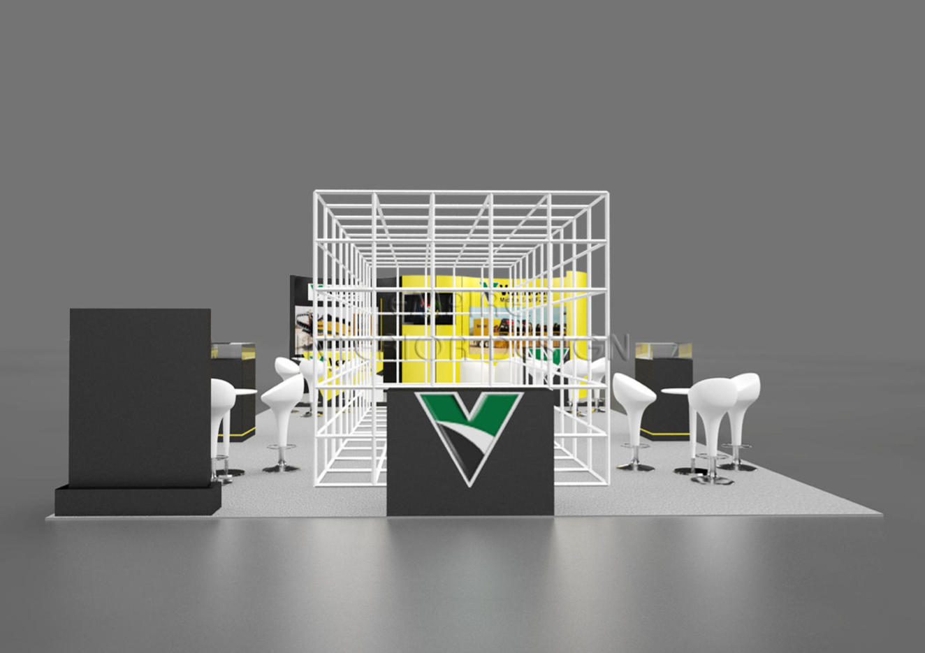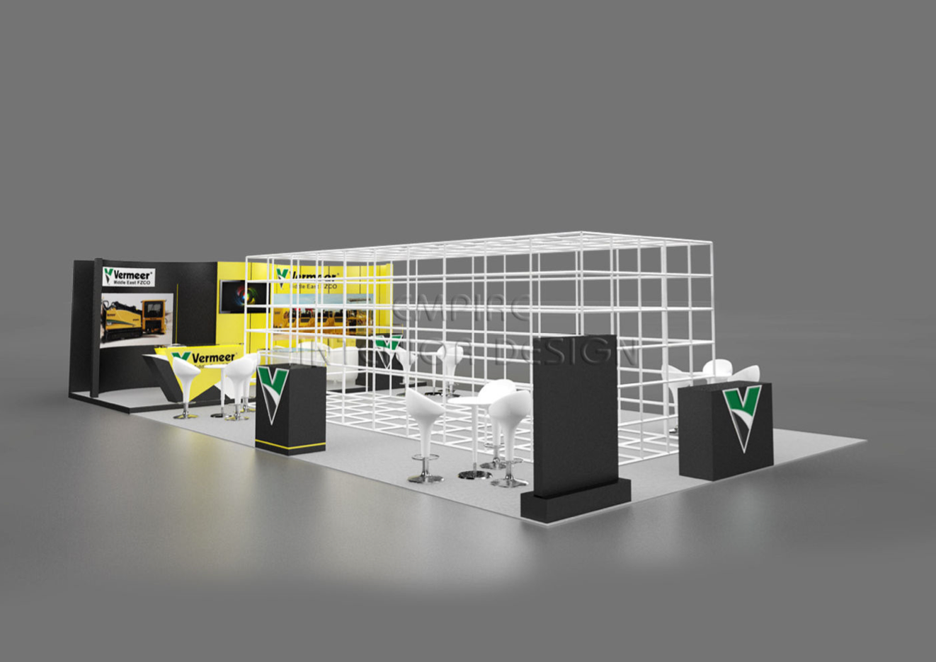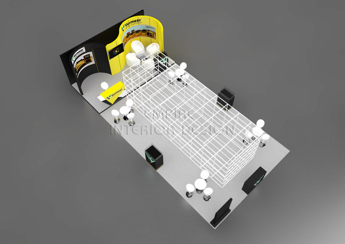 - 3D designed an exhibition stand with a curved look, within which we had set up a semi-private meeting zone and a reception desk, the back of the curve coud be used as a storage room which gave an all presentative look, while focused on their corporate colours, Yellow and Green.