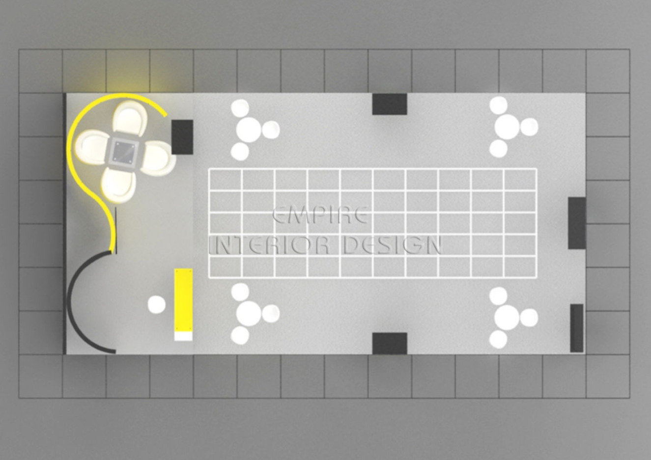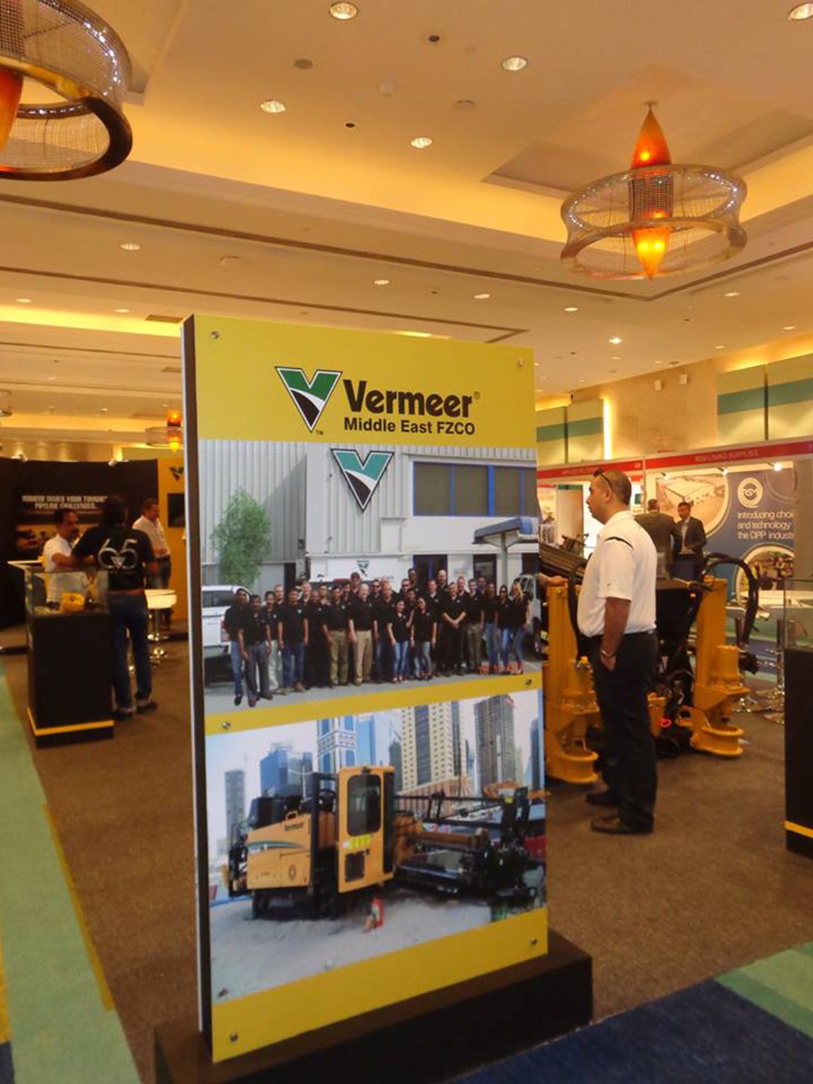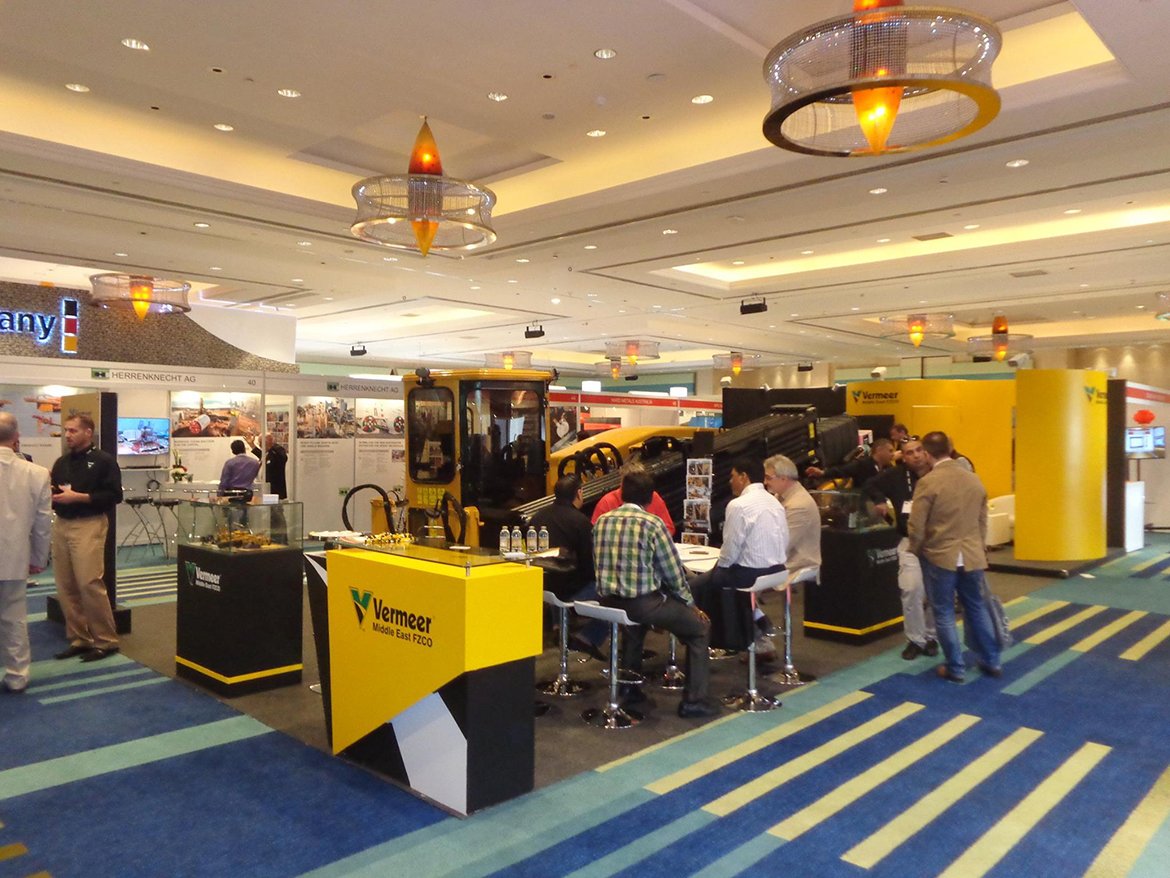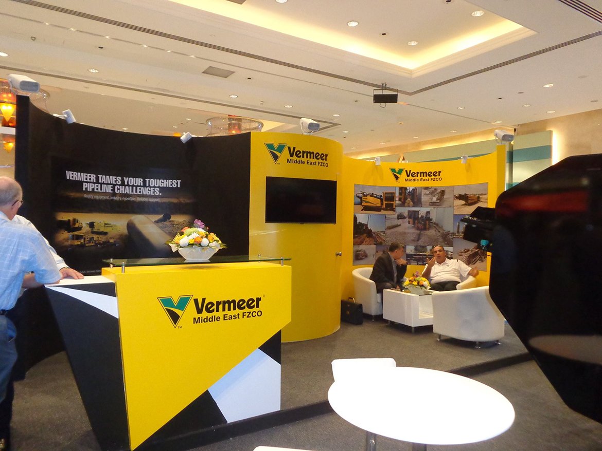 - 3D designed an exhibition stand with a curved look, within which we had set up a semi-private meeting zone and a reception desk, the back of the curve coud be used as a storage room which gave an all presentative look, while focused on their corporate colours, Yellow and Green.